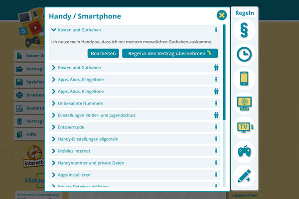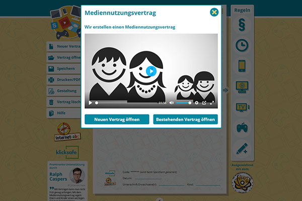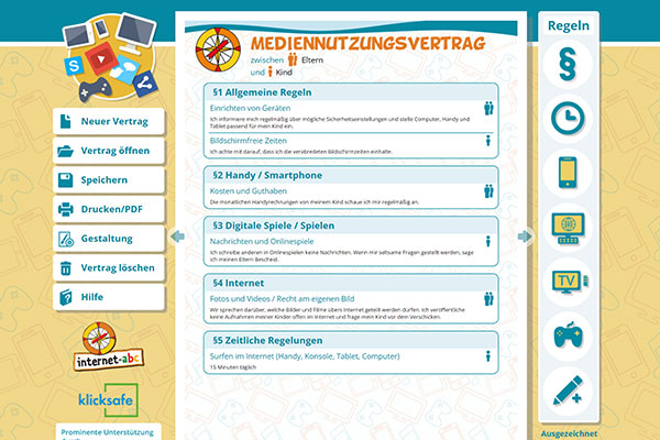 Der Mediennutzungsvertrag: Das ist eine Internetseite, auf der ihr zusammen mit euren Eltern einen Vertrag erstellen könnt. Dieser Vertrag hilft euch festzulegen, wie lange ihr vor dem Bildschirm sitzen und was ihr dort machen dürft.