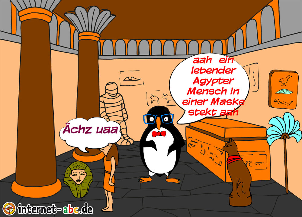 Pinguin wurde in eine Püramide ein gespert. In einer S chazkammer war eine Mumie ein lebender Mensch war da.