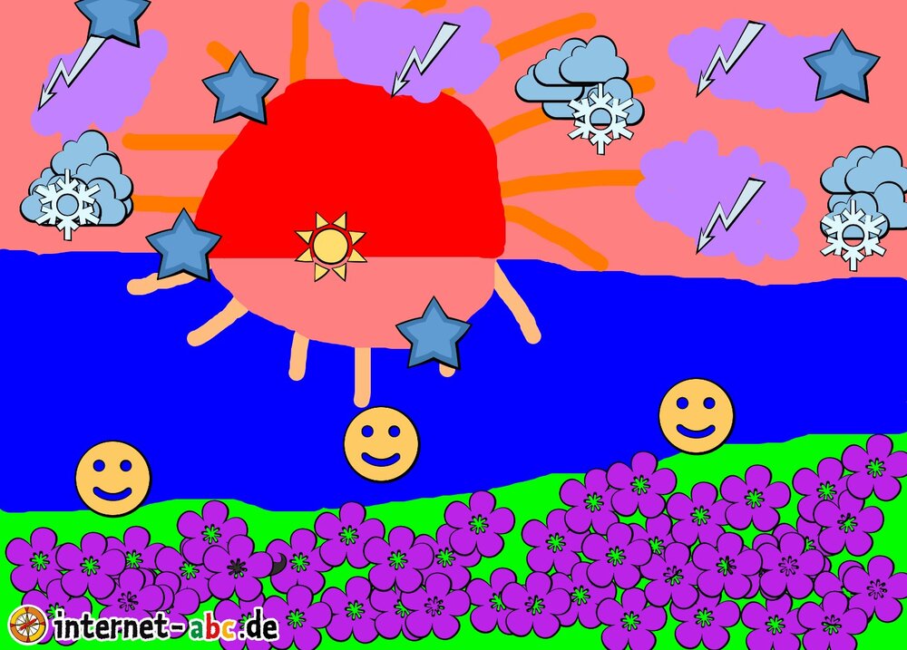 An einem warmen Sommerabend geht die Sonne im großen Mittelmeer unter und ein Gewitter zieht auf doch noch sieht mann Sterne,und Eiß-Kristalle.Außerdem gibt es auf dem Hügel vor dem Meer viele Blumen!