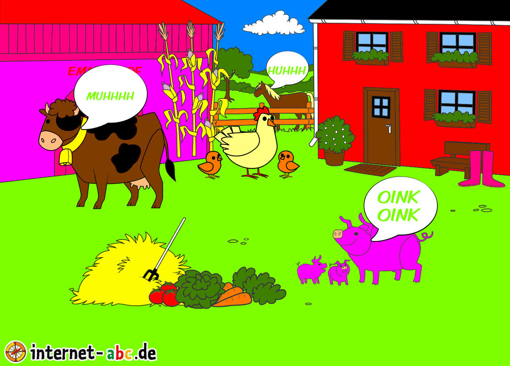 Mit Eddie zu den Hühnern? Mit Flizzy das Heu in die Scheune bringen? Malt ein Bauernhof-Bild mit dem Internet-ABC und schreibt eine schöne Geschichte dazu!