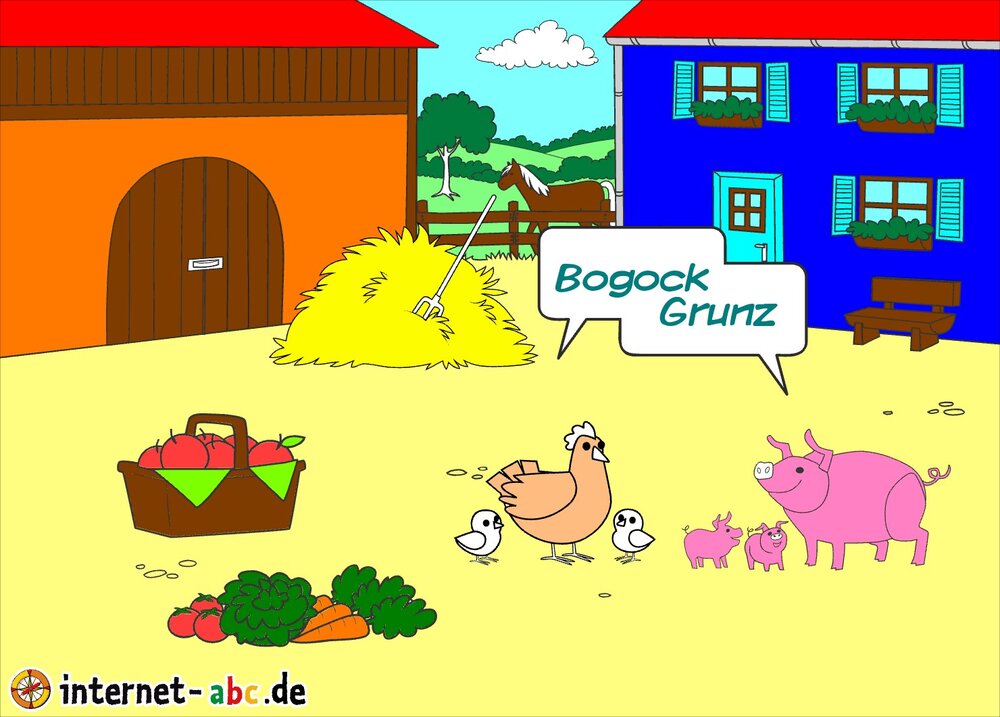 Mit Eddie zu den Hühnern? Mit Flizzy das Heu in die Scheune bringen? Malt ein Bauernhof-Bild mit dem Internet-ABC und schreibt eine schöne Geschichte dazu!