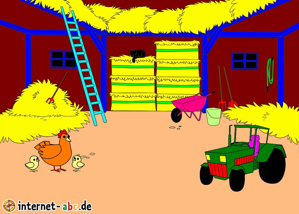 Mit Eddie zu den Hühnern? Mit Flizzy das Heu in die Scheune bringen? Malt ein Bauernhof-Bild mit dem Internet-ABC und schreibt eine schöne Geschichte dazu!