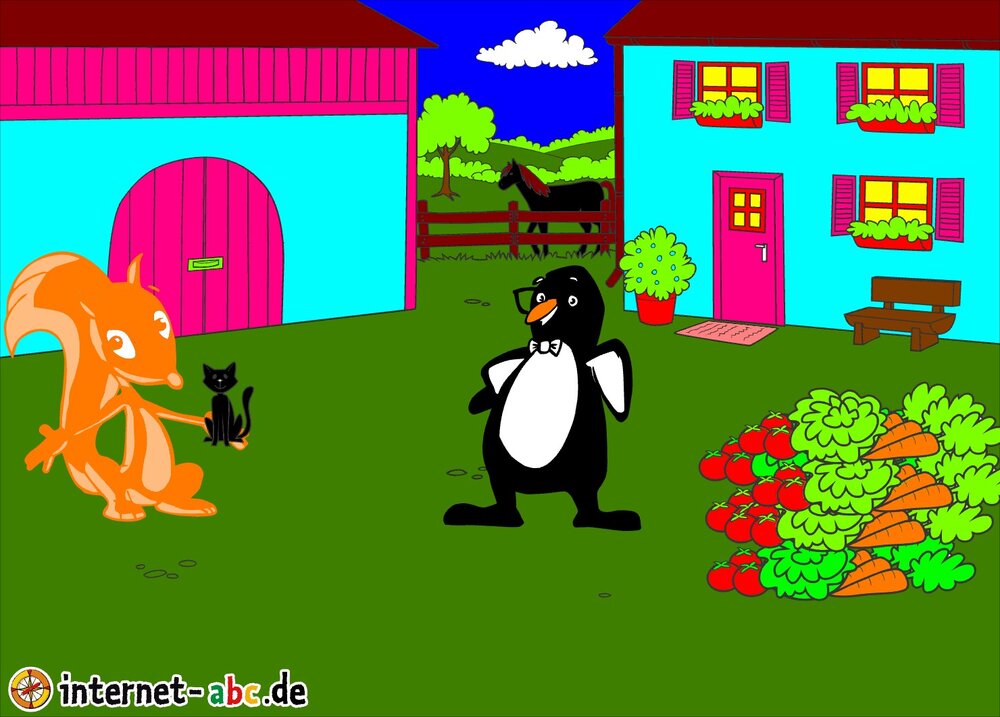 Eddi und Flizzy haben Gemüse aus der Scheune geholt. Dabei ist die schwarze Katze ausgebüchst, doch Flizzy fängt sie schnell wieder ein. Bevor sie ihre Suppe kochen, geben sie dem Pferd noch ein paar Möhren.