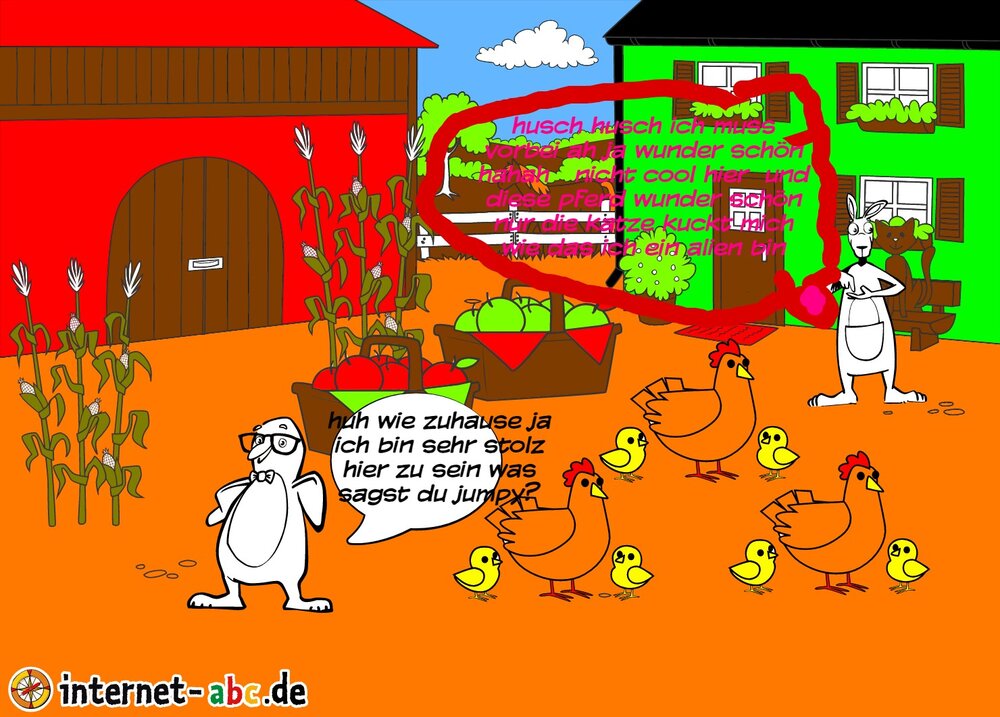Mit Eddie zu den Hühnern? Mit Flizzy das Heu in die Scheune bringen? Malt ein Bauernhof-Bild mit dem Internet-ABC und schreibt eine schöne Geschichte dazu!