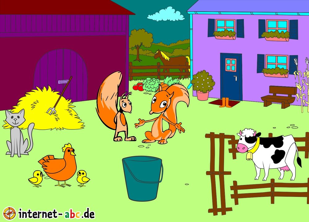 Mit Eddie zu den Hühnern? Mit Flizzy das Heu in die Scheune bringen? Malt ein Bauernhof-Bild mit dem Internet-ABC und schreibt eine schöne Geschichte dazu!