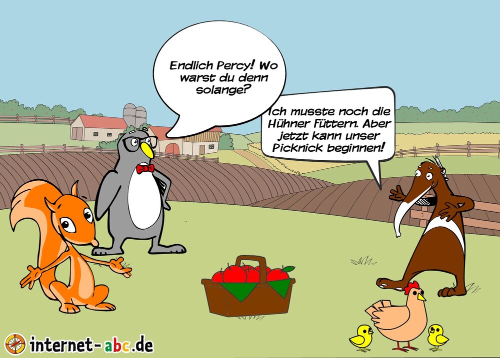 Eddi und Flitzzi warten auf Percy weil sie ein Picknick an der schönen Landluft machen wollen. Percy musste aber noch seine Hühner füttern. Aber dann kommt er und sie können picknicken.