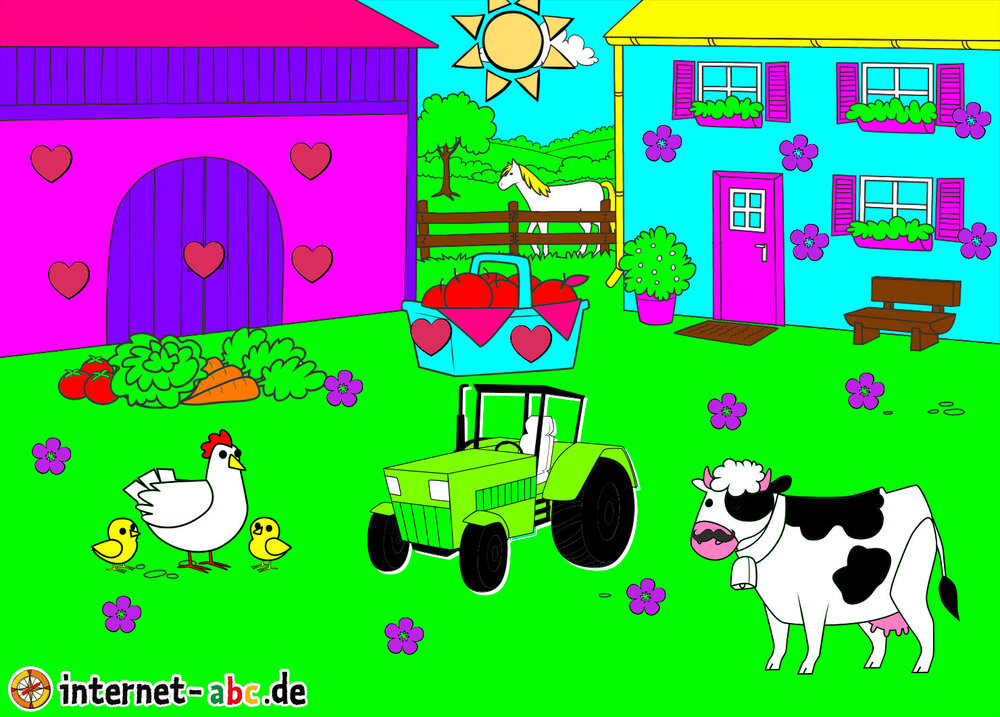 Mit Eddie zu den Hühnern? Mit Flizzy das Heu in die Scheune bringen? Malt ein Bauernhof-Bild mit dem Internet-ABC und schreibt eine schöne Geschichte dazu!