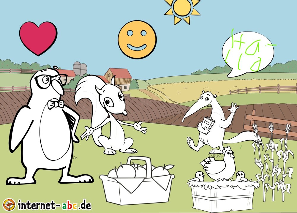 Mit Eddie zu den Hühnern? Mit Flizzy das Heu in die Scheune bringen? Malt ein Bauernhof-Bild mit dem Internet-ABC und schreibt eine schöne Geschichte dazu!