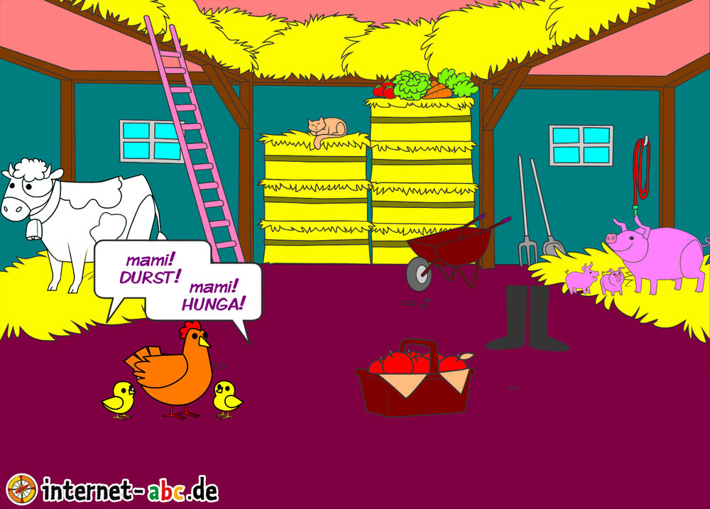 Mit Eddie zu den Hühnern? Mit Flizzy das Heu in die Scheune bringen? Malt ein Bauernhof-Bild mit dem Internet-ABC und schreibt eine schöne Geschichte dazu!
