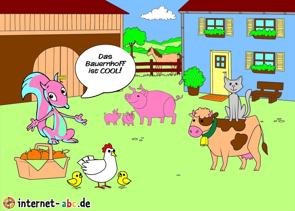 Mit Eddie zu den Hühnern? Mit Flizzy das Heu in die Scheune bringen? Malt ein Bauernhof-Bild mit dem Internet-ABC und schreibt eine schöne Geschichte dazu!