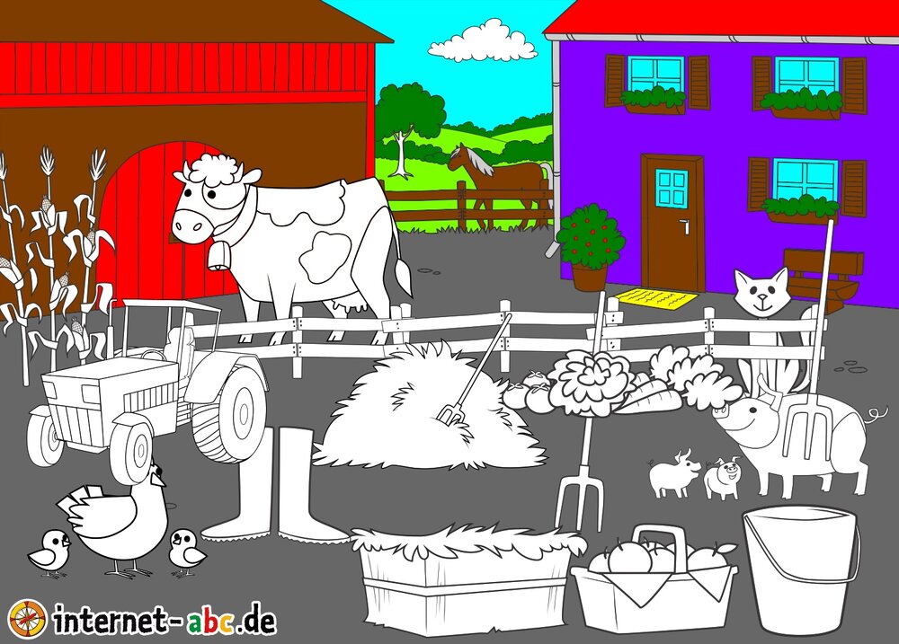 Mit Eddie zu den Hühnern? Mit Flizzy das Heu in die Scheune bringen? Malt ein Bauernhof-Bild mit dem Internet-ABC und schreibt eine schöne Geschichte dazu!