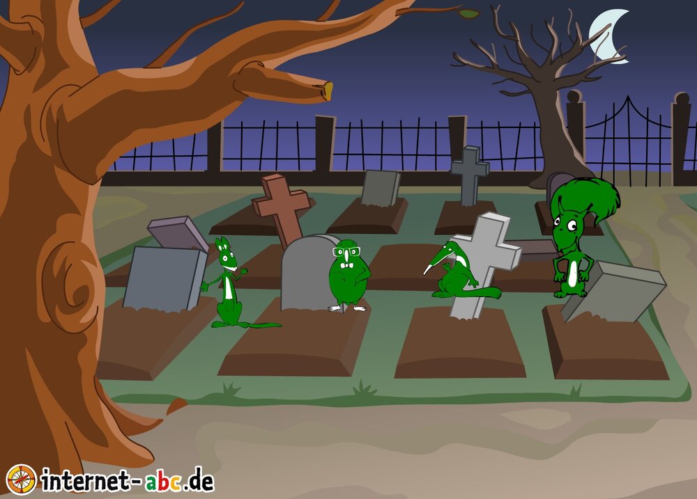 Gruseln mit Eddie, Flizzy, Percy und Jumpy - auf dem Friedhof oder in einem einsamen Schloss! Fledermäuse und Gespenster kreisen um sie herum. Malt Halloween-Bilder und schreibt Geschichten dazu!