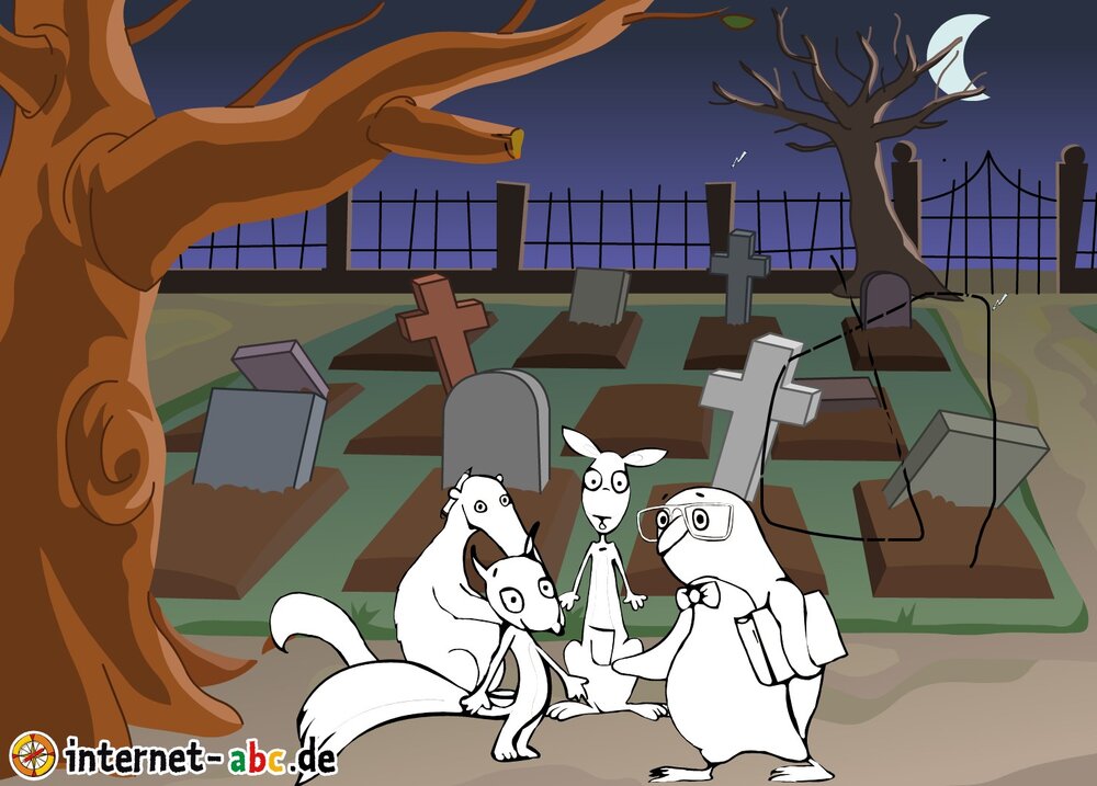 Gruseln mit Eddie, Flizzy, Percy und Jumpy - auf dem Friedhof oder in einem einsamen Schloss! Fledermäuse und Gespenster kreisen um sie herum. Malt Halloween-Bilder und schreibt Geschichten dazu!