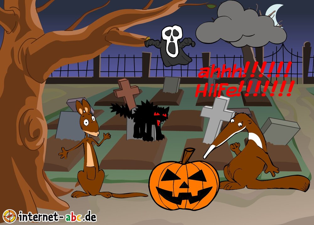 Gruseln mit Eddie, Flizzy, Percy und Jumpy - auf dem Friedhof oder in einem einsamen Schloss! Fledermäuse und Gespenster kreisen um sie herum. Malt Halloween-Bilder und schreibt Geschichten dazu!