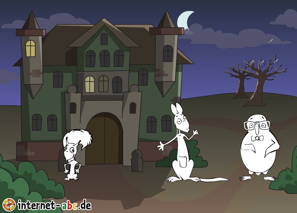Gruseln mit Eddie, Flizzy, Percy und Jumpy - auf dem Friedhof oder in einem einsamen Schloss! Fledermäuse und Gespenster kreisen um sie herum. Malt Halloween-Bilder und schreibt Geschichten dazu!