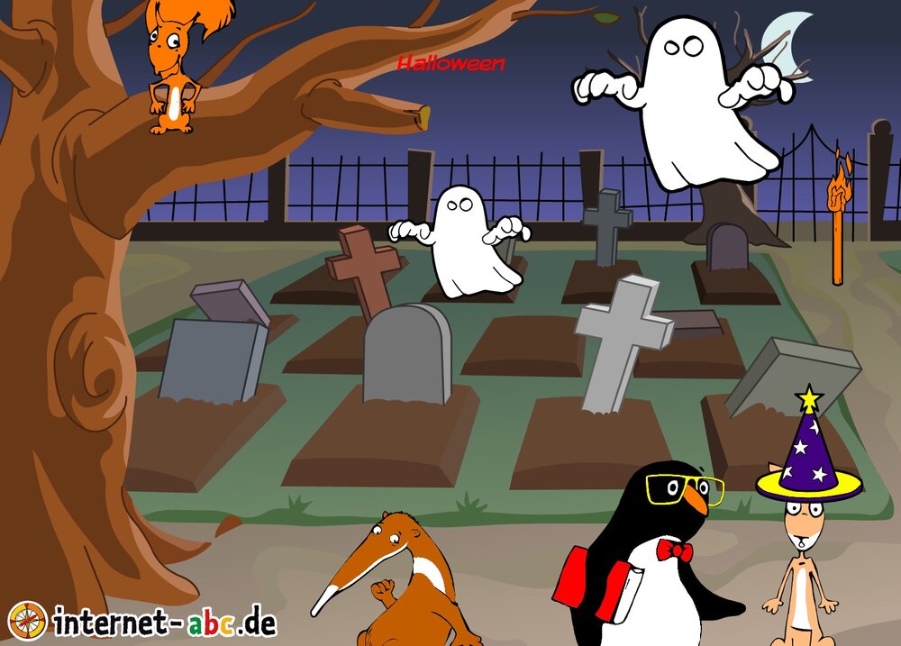 Gruseln mit Eddie, Flizzy, Percy und Jumpy - auf dem Friedhof oder in einem einsamen Schloss! Fledermäuse und Gespenster kreisen um sie herum. Malt Halloween-Bilder und schreibt Geschichten dazu!