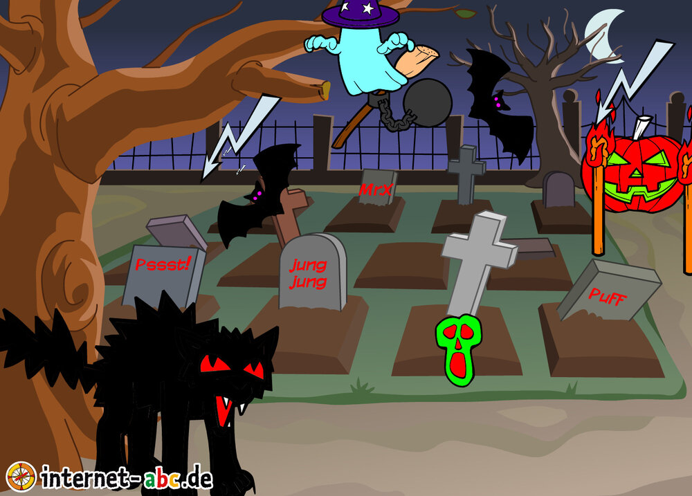 Gruseln mit Eddie, Flizzy, Percy und Jumpy - auf dem Friedhof oder in einem einsamen Schloss! Fledermäuse und Gespenster kreisen um sie herum. Malt Halloween-Bilder und schreibt Geschichten dazu!