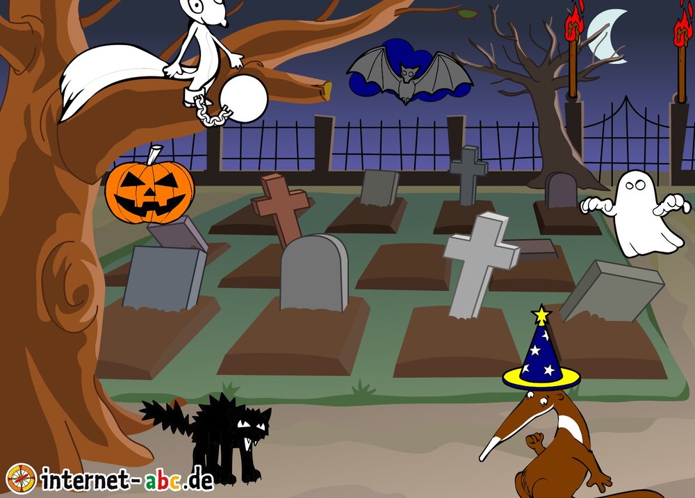 Gruseln mit Eddie, Flizzy, Percy und Jumpy - auf dem Friedhof oder in einem einsamen Schloss! Fledermäuse und Gespenster kreisen um sie herum. Malt Halloween-Bilder und schreibt Geschichten dazu!