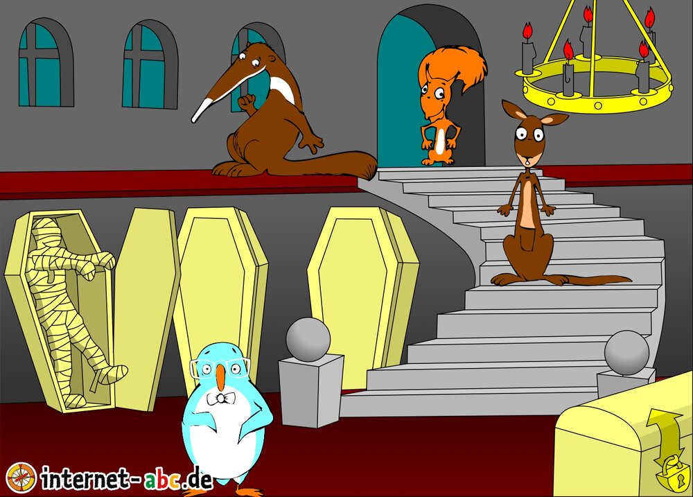 Gruseln mit Eddie, Flizzy, Percy und Jumpy - auf dem Friedhof oder in einem einsamen Schloss! Fledermäuse und Gespenster kreisen um sie herum. Malt Halloween-Bilder und schreibt Geschichten dazu!