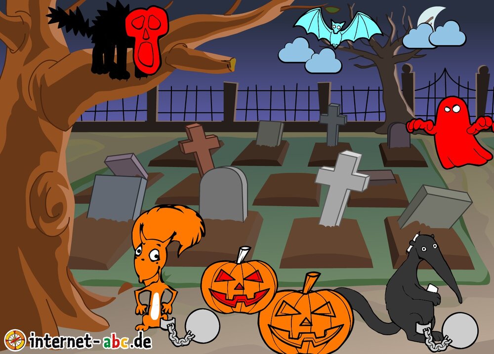 Gruseln mit Eddie, Flizzy, Percy und Jumpy - auf dem Friedhof oder in einem einsamen Schloss! Fledermäuse und Gespenster kreisen um sie herum. Malt Halloween-Bilder und schreibt Geschichten dazu!