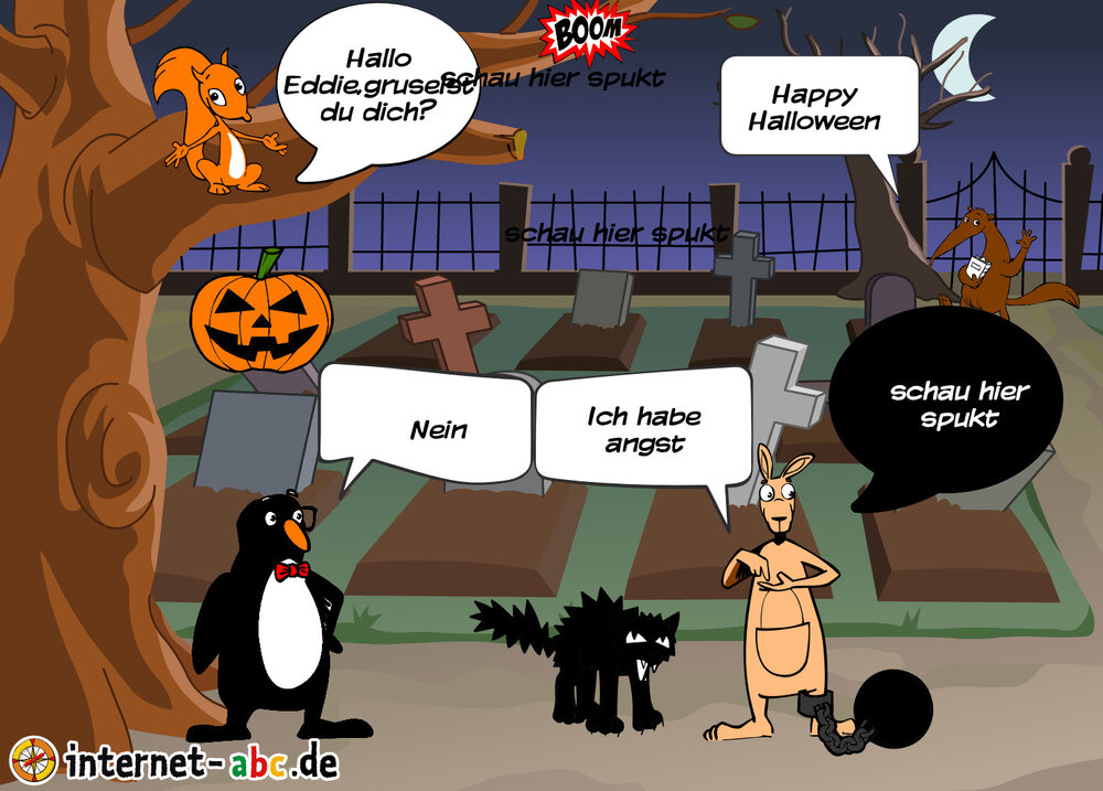 Gruseln mit Eddie, Flizzy, Percy und Jumpy - auf dem Friedhof oder in einem einsamen Schloss! Fledermäuse und Gespenster kreisen um sie herum. Malt Halloween-Bilder und schreibt Geschichten dazu!