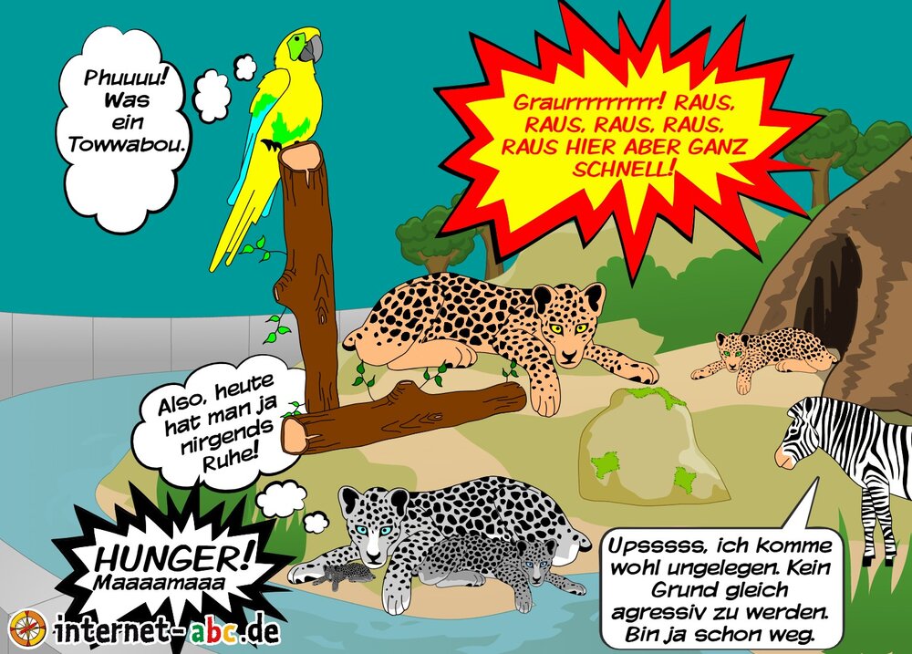 Im Zoo gehts wild ab; Das Zebra ist nicht gerade willkommen bei der Familie Jaguar. Und dieser Krach. Ist ja nicht zum aushalten.