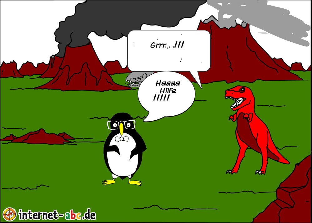 Der Dino erschreckt den Pinguin.