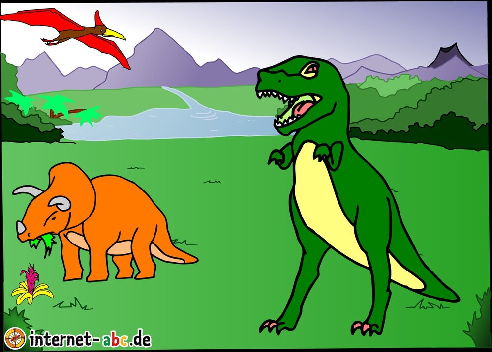 ich liebe Dinosaurier also habe ich ein bild über sie gemalt . Auf dem bild sieht man einen t-Rex einen Flugsaurier und einen Triceratops.