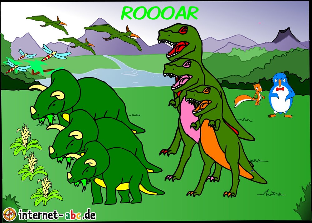 Pinguin Eddie ist mit Eichhörnchen Fizzi wieder mal im Internet unterwegs. Sie wollten diesmal in die Urzeit surfen. Doch da angekommen sehen sie direkt vor ihnen eine Dino Familie, die eine Stegosaurus Familie angreifen wollte. Und als sie auf den Himmel schauen, sehen sie eine fliegende Saurierfamilie! Schließlich sehen sie drei Libellen die rot und gelb gestreift sind! Nun hatten sie genug gesehen. Wenn sie wieder daheim sind, werden sie bestimmt ganz viel zu erzählen haben.