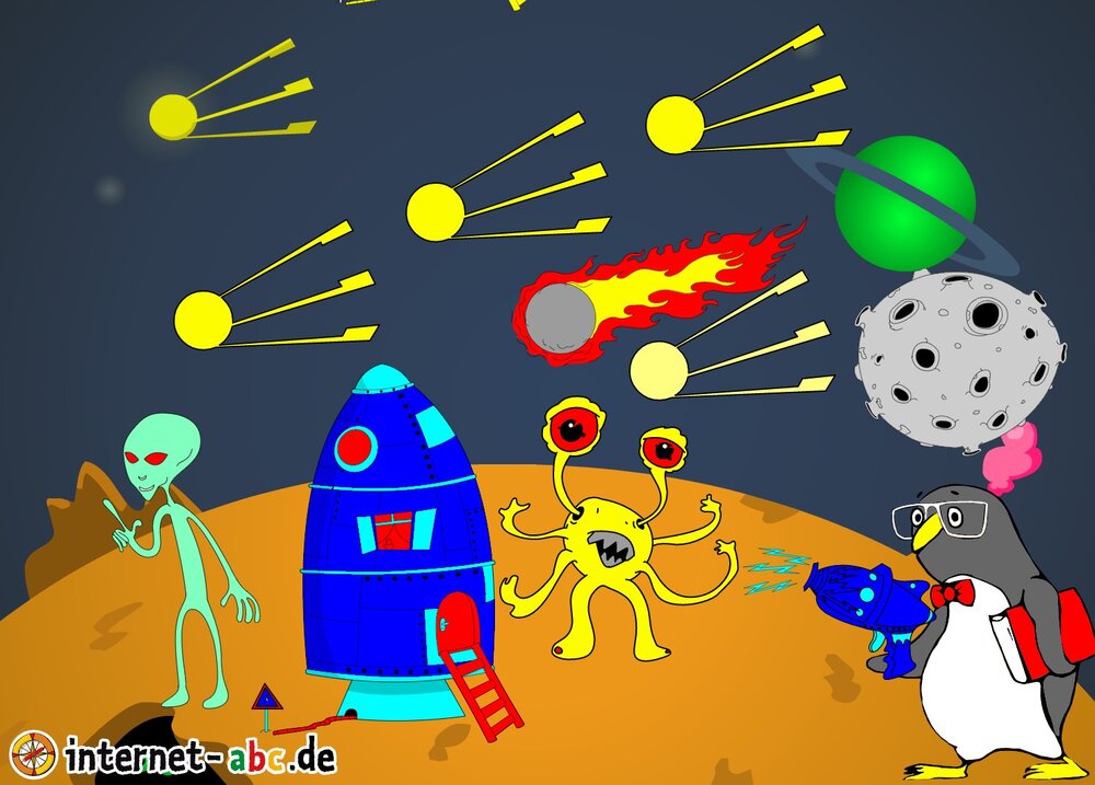 Mit der Rakete fliegen die 4 Internet-ABC-Tiere in den Weltraum. Was sie dort sehen und erleben, könnt ihr in diesem Baukasten malen und erzählen.