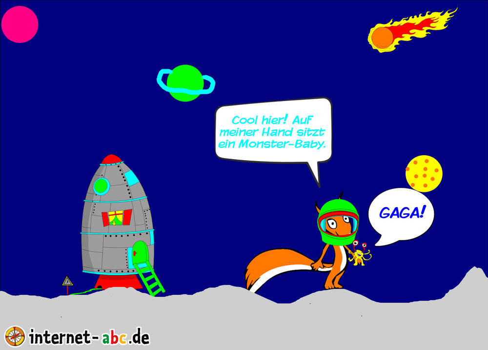 Mit der Rakete fliegen die 4 Internet-ABC-Tiere in den Weltraum. Was sie dort sehen und erleben, könnt ihr in diesem Baukasten malen und erzählen.