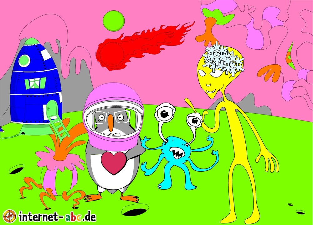 Mit der Rakete fliegen die 4 Internet-ABC-Tiere in den Weltraum. Was sie dort sehen und erleben, könnt ihr in diesem Baukasten malen und erzählen.