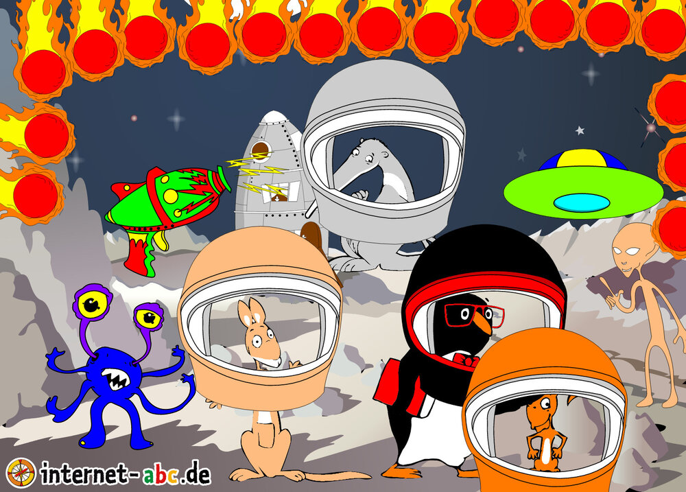 Mit der Rakete fliegen die 4 Internet-ABC-Tiere in den Weltraum. Was sie dort sehen und erleben, könnt ihr in diesem Baukasten malen und erzählen.