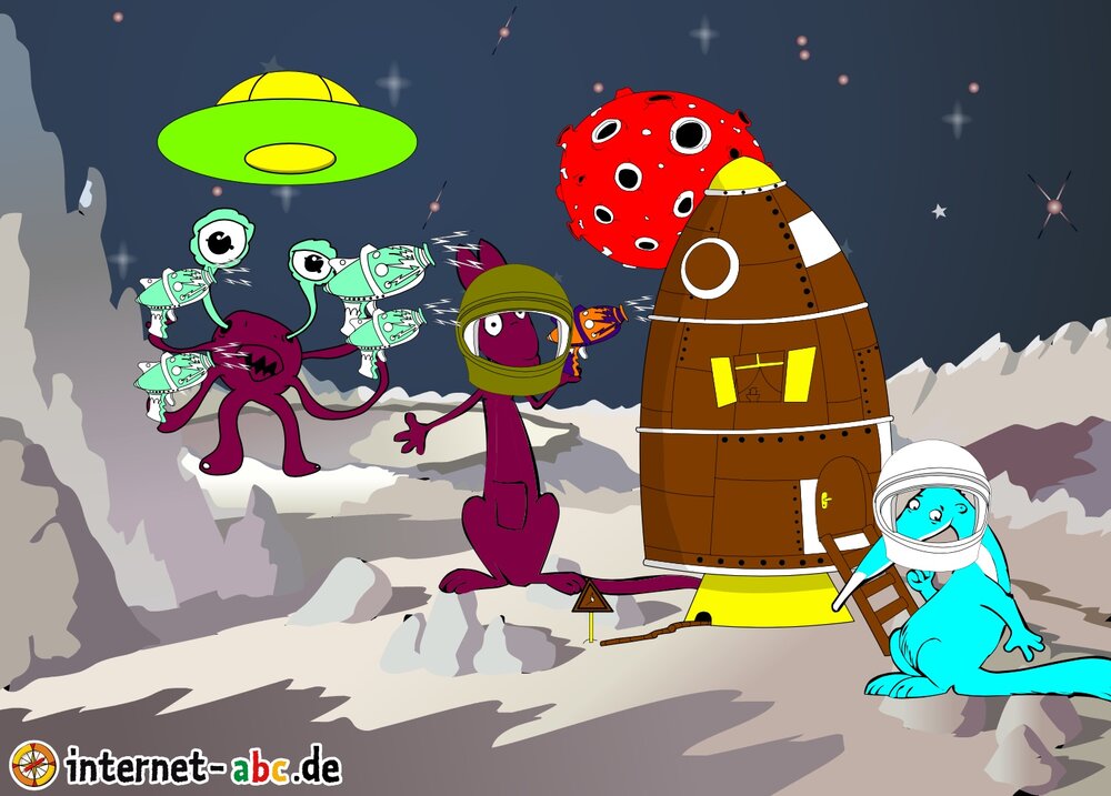 Mit der Rakete fliegen die 4 Internet-ABC-Tiere in den Weltraum. Was sie dort sehen und erleben, könnt ihr in diesem Baukasten malen und erzählen.