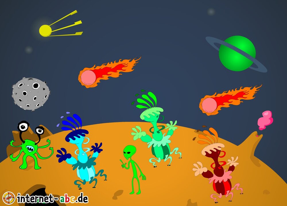Mit der Rakete fliegen die 4 Internet-ABC-Tiere in den Weltraum. Was sie dort sehen und erleben, könnt ihr in diesem Baukasten malen und erzählen.