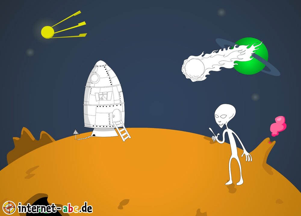 Mit der Rakete fliegen die 4 Internet-ABC-Tiere in den Weltraum. Was sie dort sehen und erleben, könnt ihr in diesem Baukasten malen und erzählen.