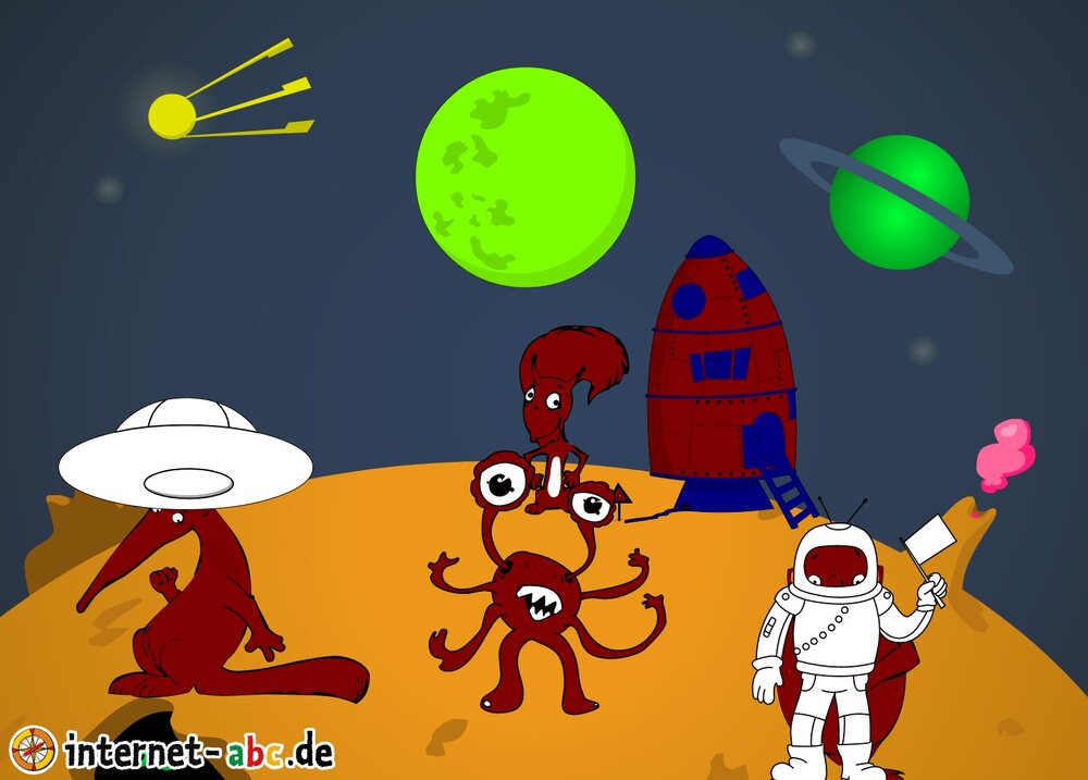 Mit der Rakete fliegen die 4 Internet-ABC-Tiere in den Weltraum. Was sie dort sehen und erleben, könnt ihr in diesem Baukasten malen und erzählen.