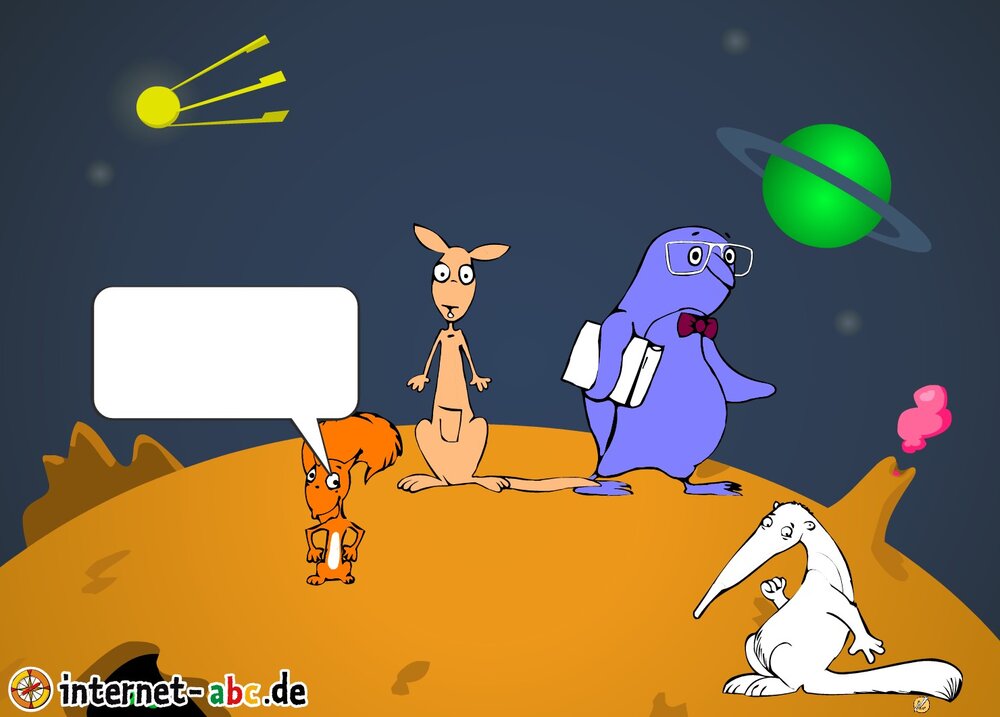Mit der Rakete fliegen die 4 Internet-ABC-Tiere in den Weltraum. Was sie dort sehen und erleben, könnt ihr in diesem Baukasten malen und erzählen.