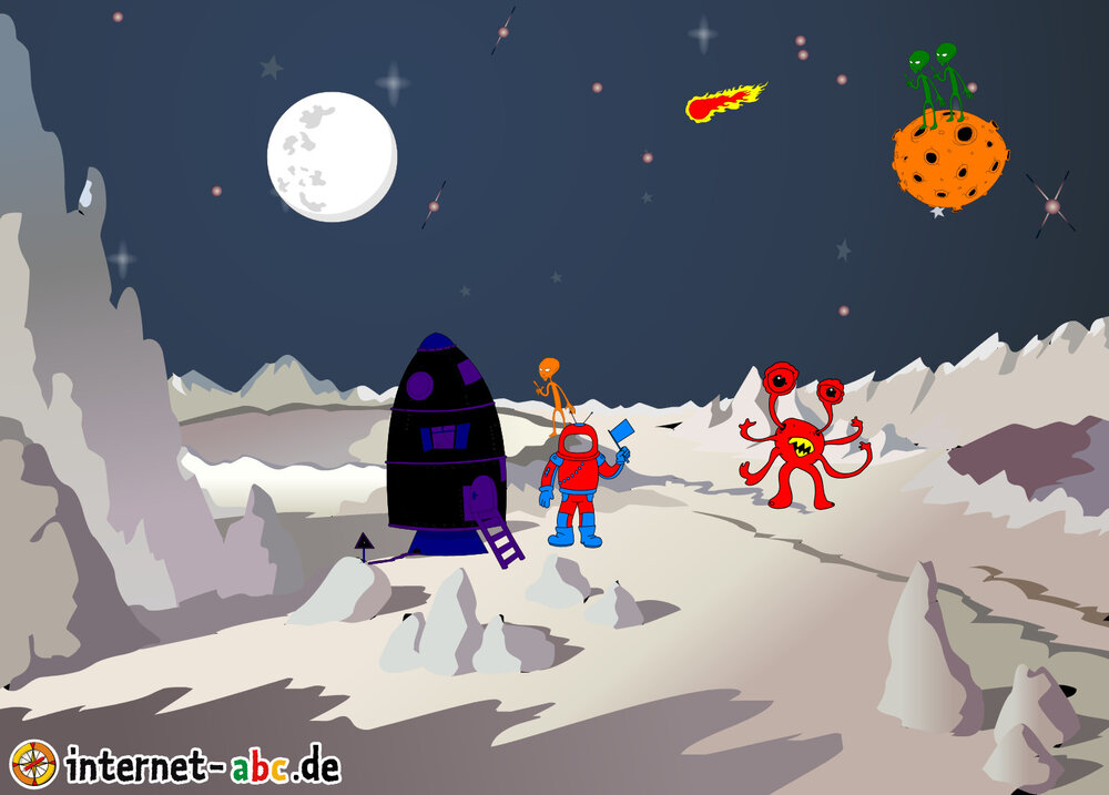 Mit der Rakete fliegen die 4 Internet-ABC-Tiere in den Weltraum. Was sie dort sehen und erleben, könnt ihr in diesem Baukasten malen und erzählen.