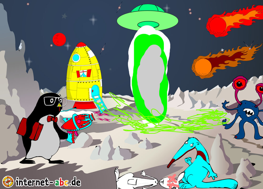 Mit der Rakete fliegen die 4 Internet-ABC-Tiere in den Weltraum. Was sie dort sehen und erleben, könnt ihr in diesem Baukasten malen und erzählen.