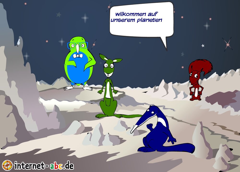 Mit der Rakete fliegen die 4 Internet-ABC-Tiere in den Weltraum. Was sie dort sehen und erleben, könnt ihr in diesem Baukasten malen und erzählen.