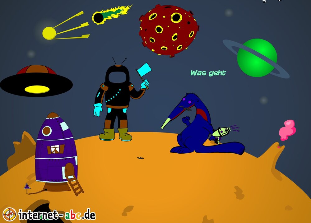 Mit der Rakete fliegen die 4 Internet-ABC-Tiere in den Weltraum. Was sie dort sehen und erleben, könnt ihr in diesem Baukasten malen und erzählen.