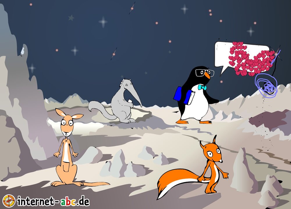 Mit der Rakete fliegen die 4 Internet-ABC-Tiere in den Weltraum. Was sie dort sehen und erleben, könnt ihr in diesem Baukasten malen und erzählen.