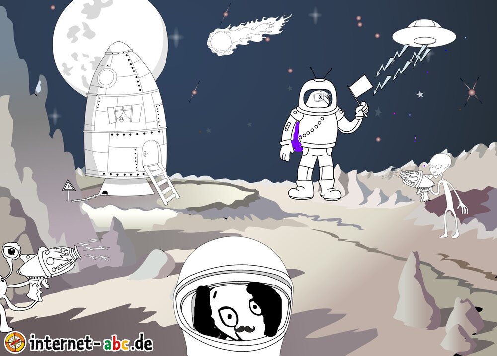 Mit der Rakete fliegen die 4 Internet-ABC-Tiere in den Weltraum. Was sie dort sehen und erleben, könnt ihr in diesem Baukasten malen und erzählen.