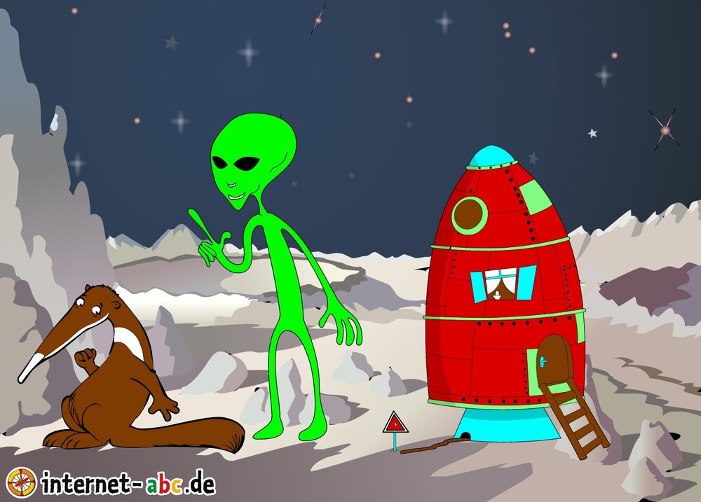 Mit der Rakete fliegen die 4 Internet-ABC-Tiere in den Weltraum. Was sie dort sehen und erleben, könnt ihr in diesem Baukasten malen und erzählen.