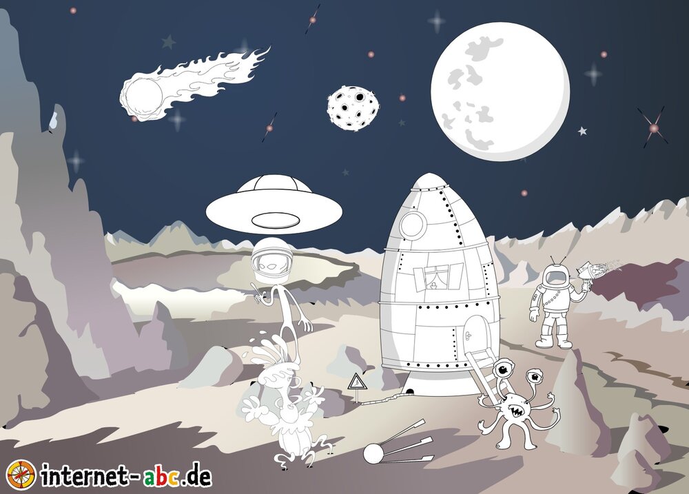 Mit der Rakete fliegen die 4 Internet-ABC-Tiere in den Weltraum. Was sie dort sehen und erleben, könnt ihr in diesem Baukasten malen und erzählen.