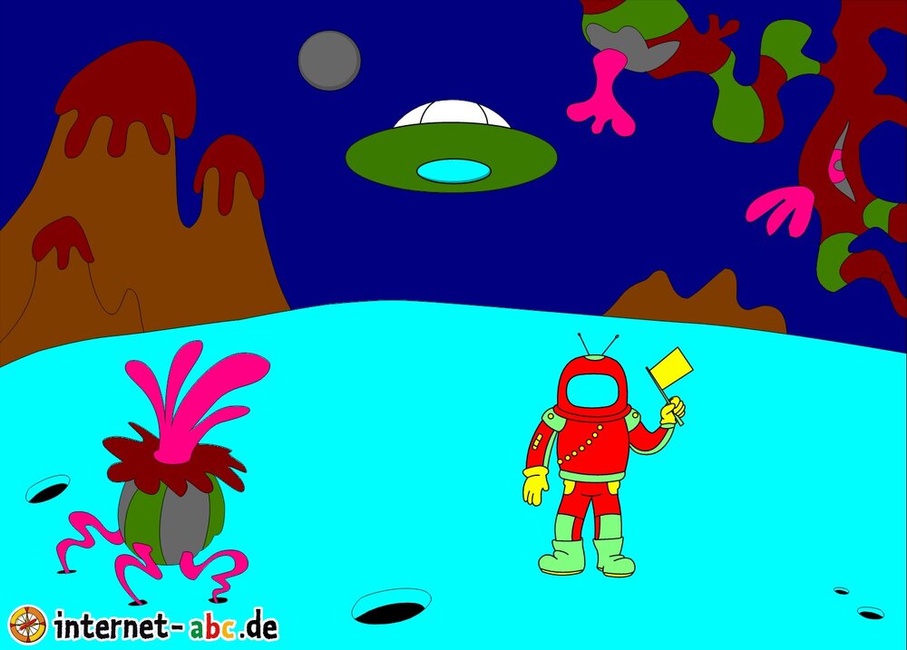 Mit der Rakete fliegen die 4 Internet-ABC-Tiere in den Weltraum. Was sie dort sehen und erleben, könnt ihr in diesem Baukasten malen und erzählen.