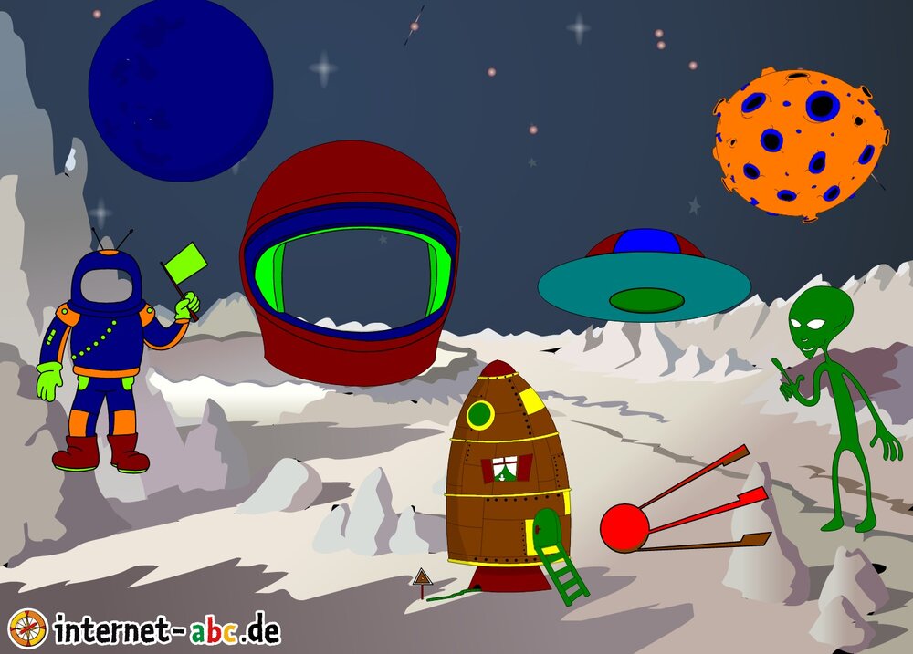 Mit der Rakete fliegen die 4 Internet-ABC-Tiere in den Weltraum. Was sie dort sehen und erleben, könnt ihr in diesem Baukasten malen und erzählen.