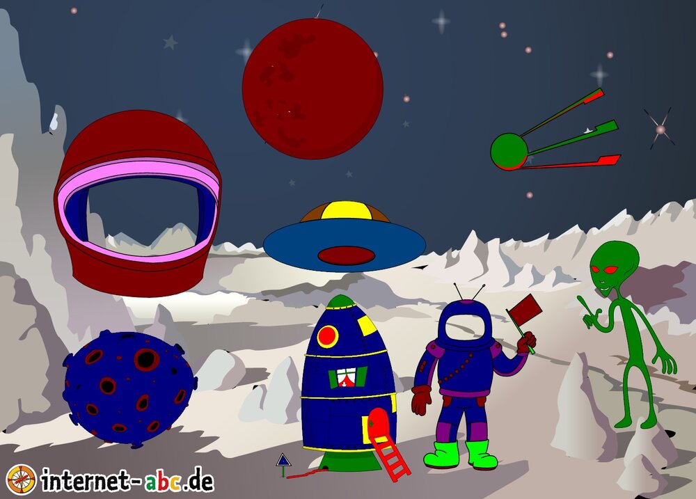 Mit der Rakete fliegen die 4 Internet-ABC-Tiere in den Weltraum. Was sie dort sehen und erleben, könnt ihr in diesem Baukasten malen und erzählen.