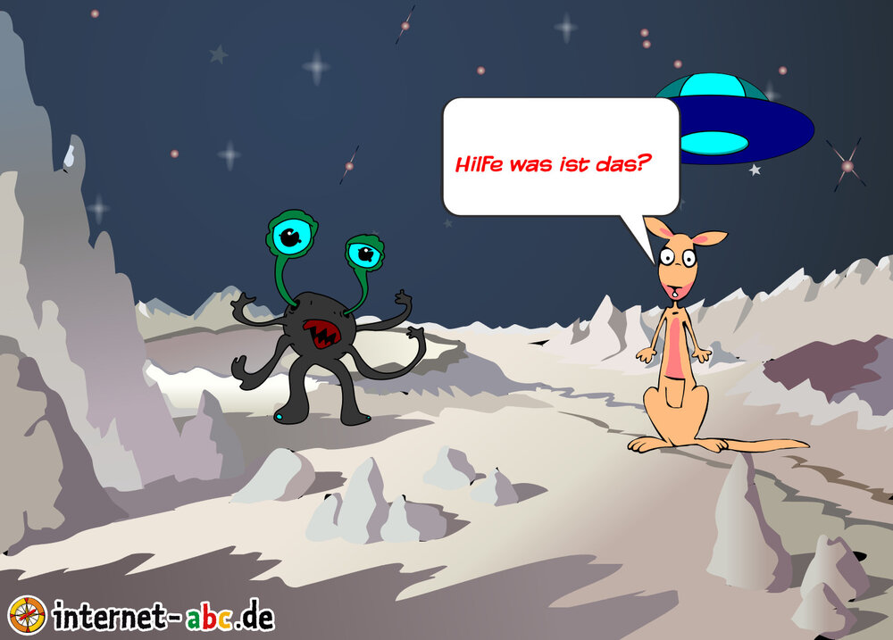 Das Mondmonster rennt hinter dem Kängeru her.Das Mondmonster kam aus dem Krater.Plötzlich nimmt das Mondmonster den Kopf ab.Puh es war nur Flizzy.